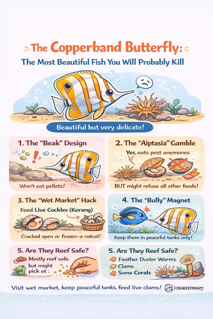 You go to the shop. You see the Copperband Butterflyfish (Chelmon rostratus). It is silver with stunning orange vertical bands and a long, delicate beak. It looks like a piece of fine china. You buy it.